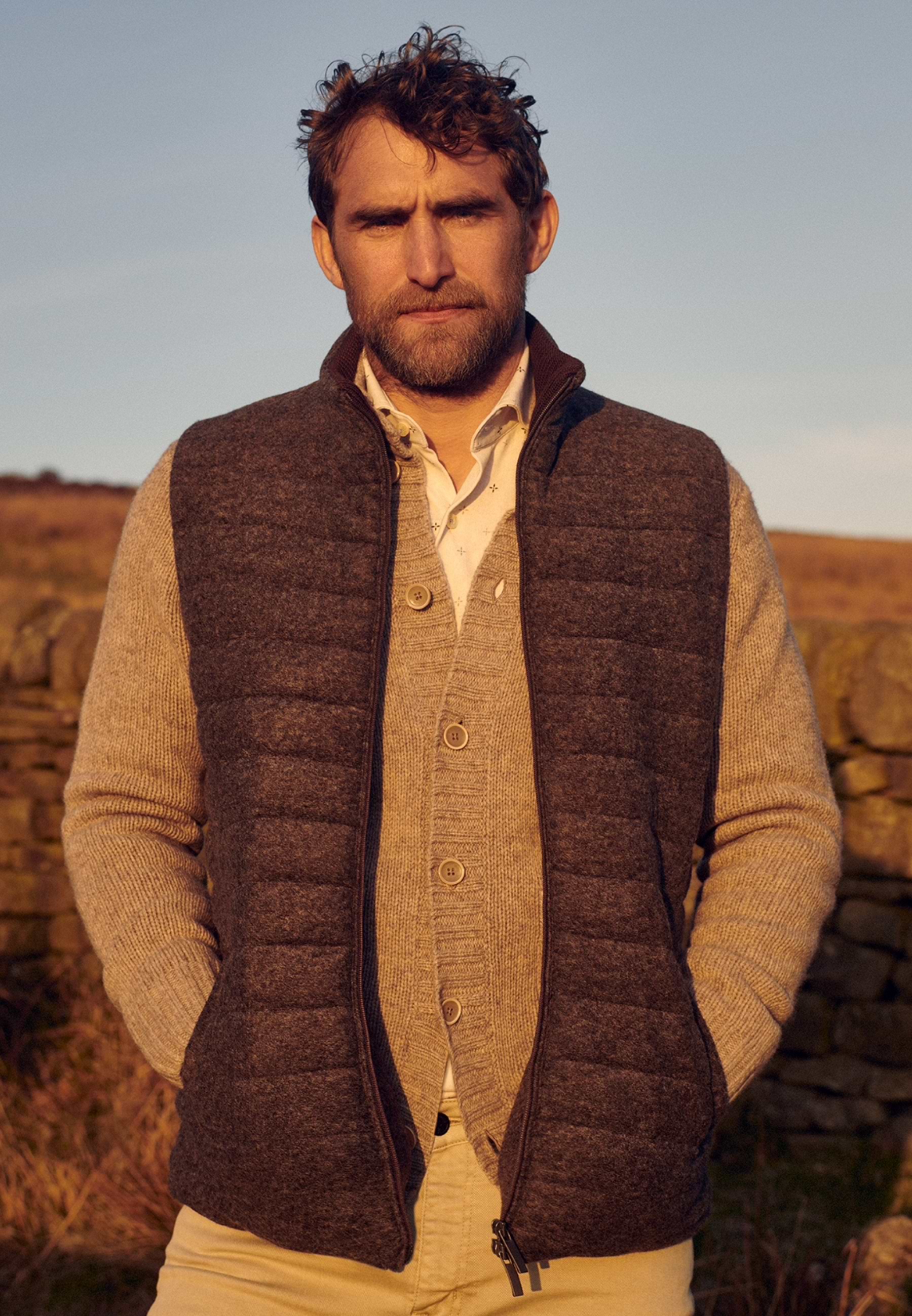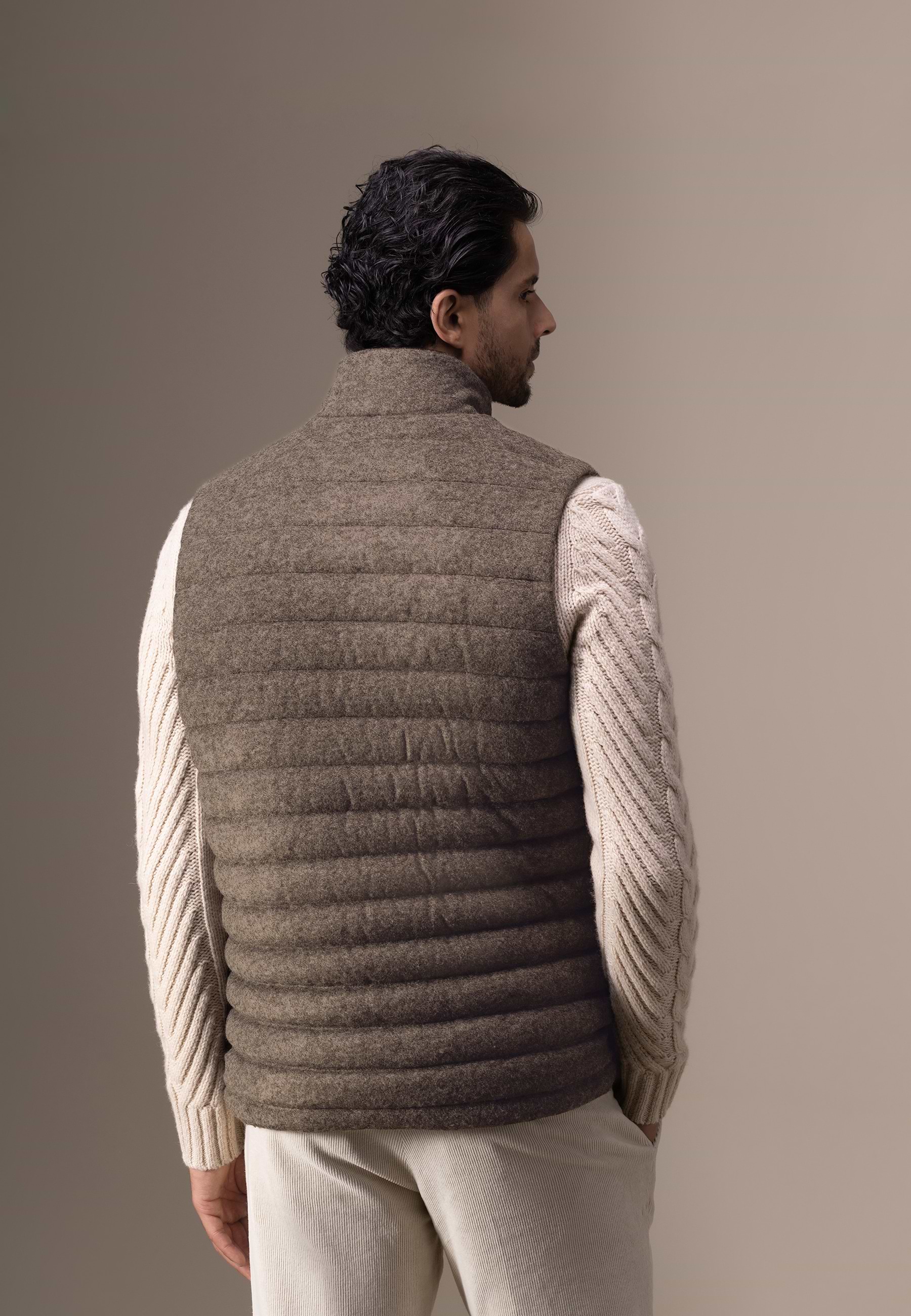 This regular fit bodywarmer is made from quilted wool fabric by Lanificio Roma, offering a warm, soft feel and refined texture. The high collar, two-way zip, zipped inner pocket and two front pockets add comfort and convenience, while the rich blend of acrylic, polyester and wool creates a firm yet flexible silhouette with a luxurious appearance.