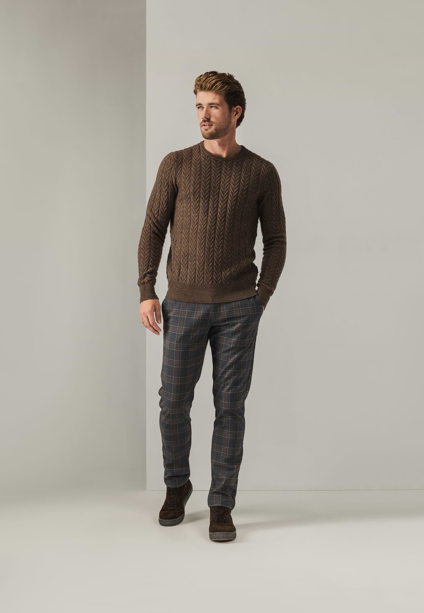 Ce chino NAVIGATOR en tissu extensible est un mélange de polyester, de viscose et d'élasthanne et a une coupe classique. Le motif à carreaux classique confère au pantalon une allure soignée, tandis que les côtés élastiques de la ceinture assurent un confort supplémentaire. Avec ses poches fendues à l'avant, ses poches passepoilées à l'arrière et sa ceinture munie de passants, d'un bouton et d'une fermeture éclair, ce modèle est polyvalent.