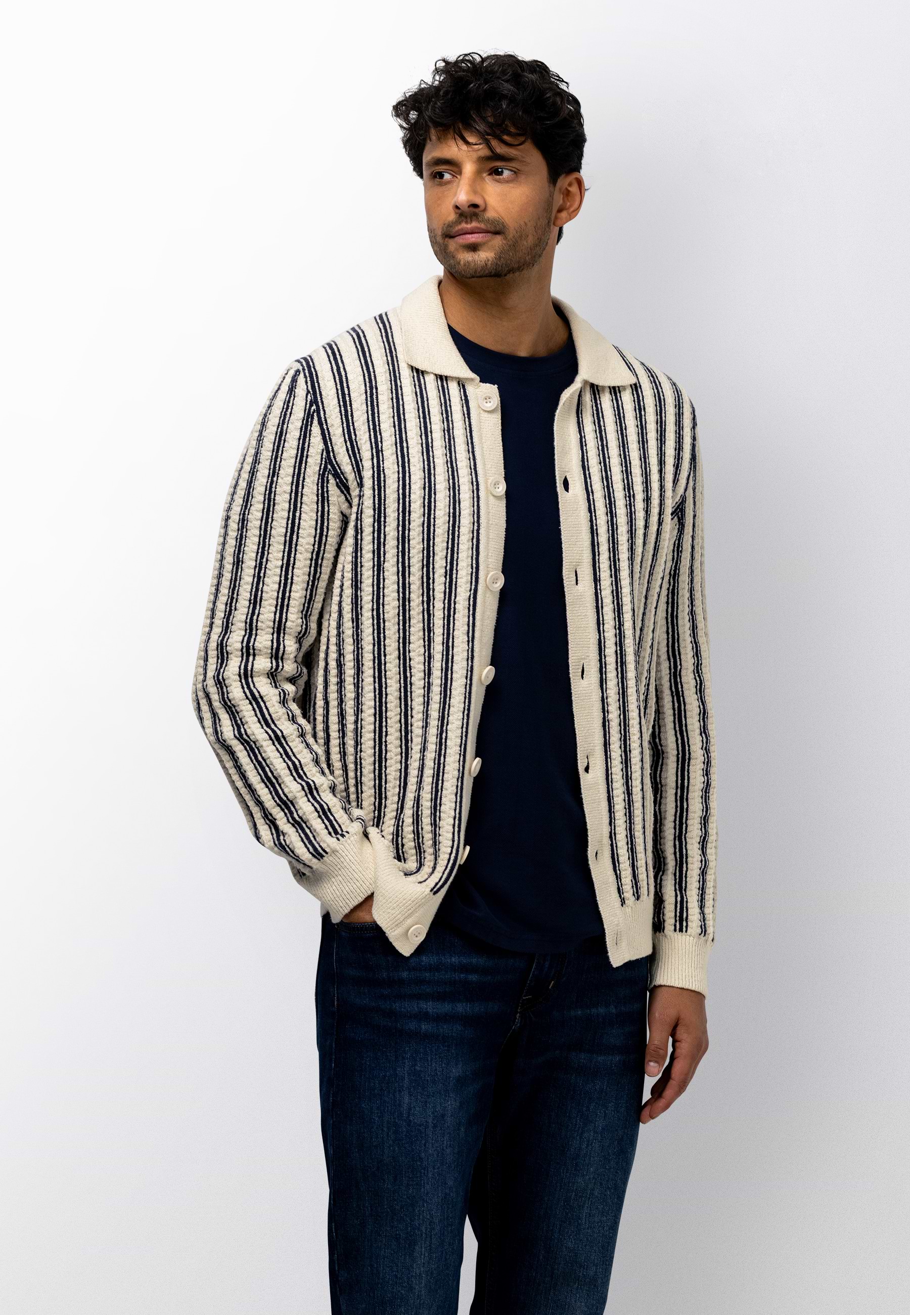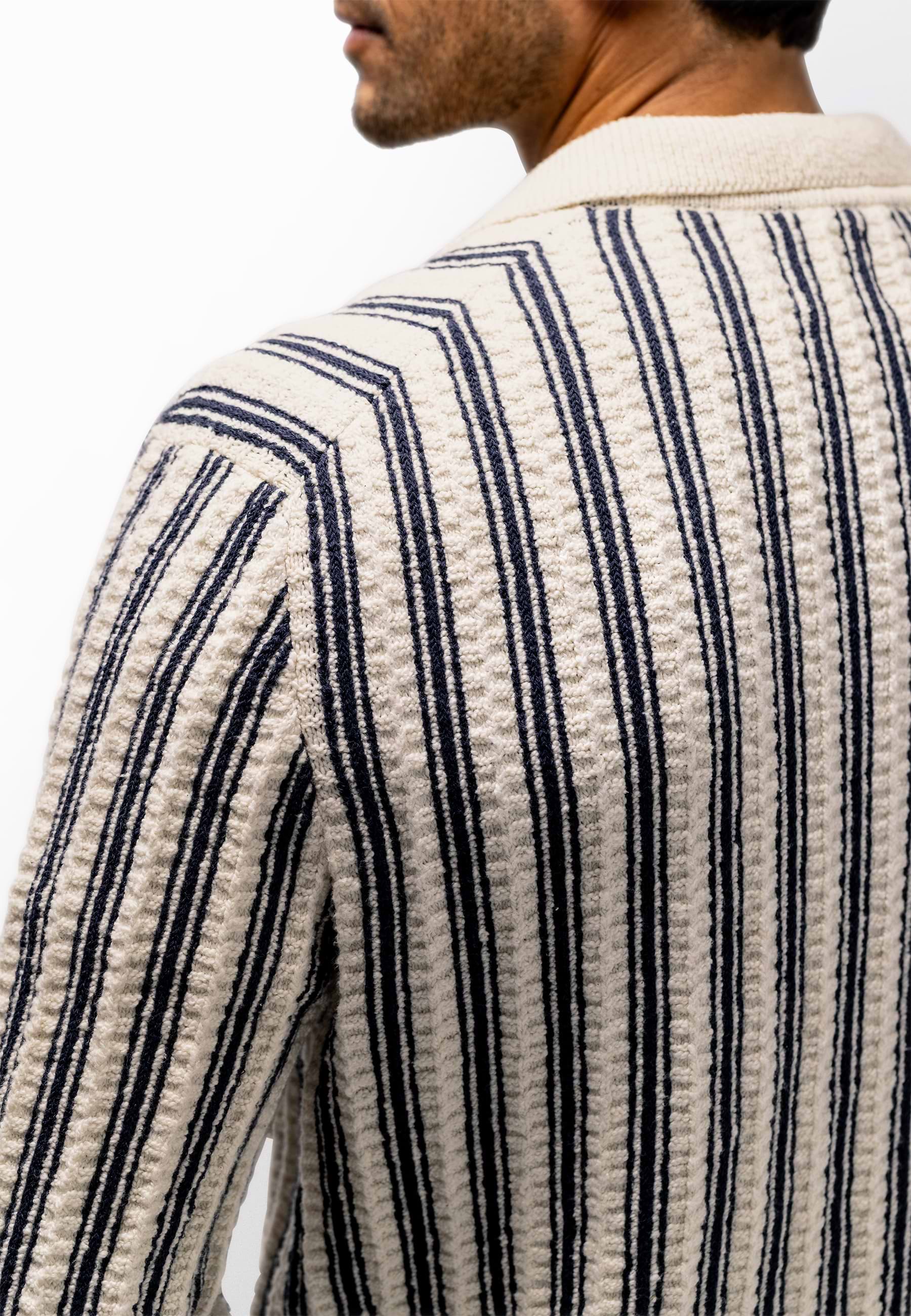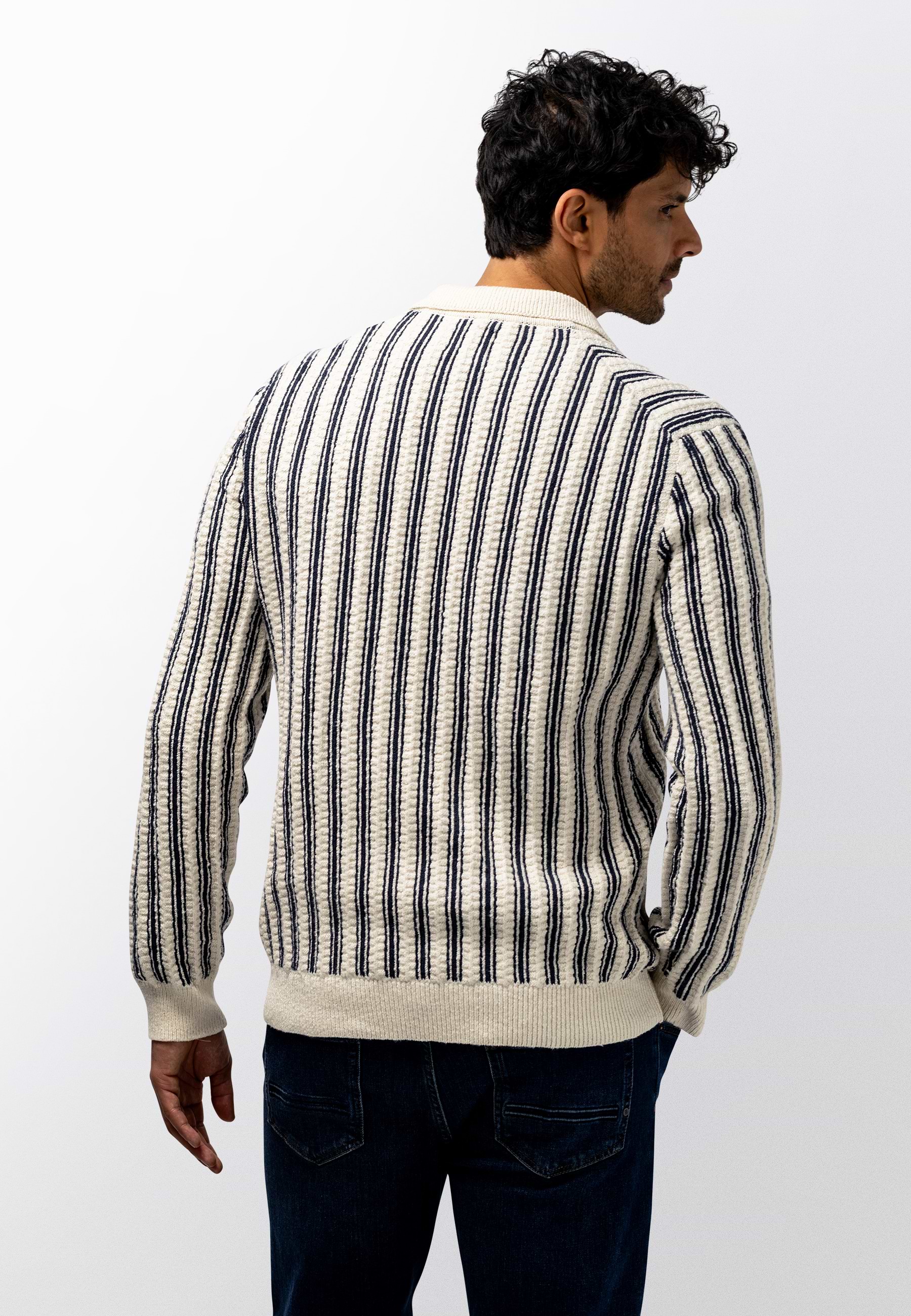 Polovest met een verticaal gestreept dessin en een comfortabele regular fit. Uitgevoerd met een structuurpatroon, knoopsluiting en gebreid van bouclégaren voor extra textuur. De combinatie van katoen en polyamide biedt een zachte, ademende basis met extra stevigheid en vormbehoud. Dit resulteert in een comfortabel vest met een verzorgde en moderne uitstraling.