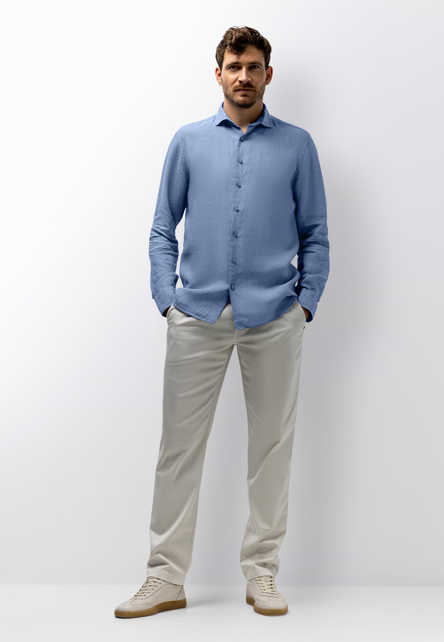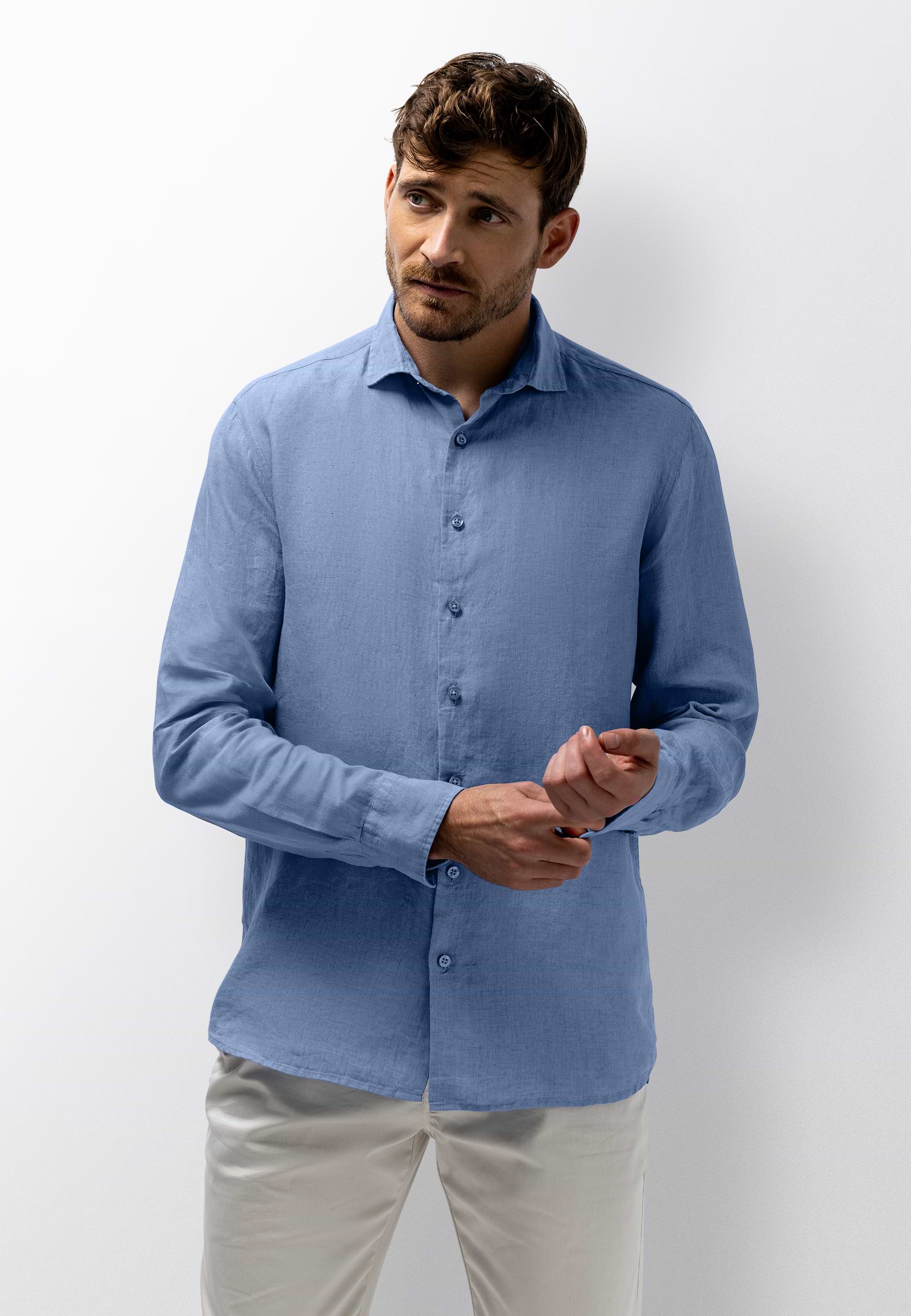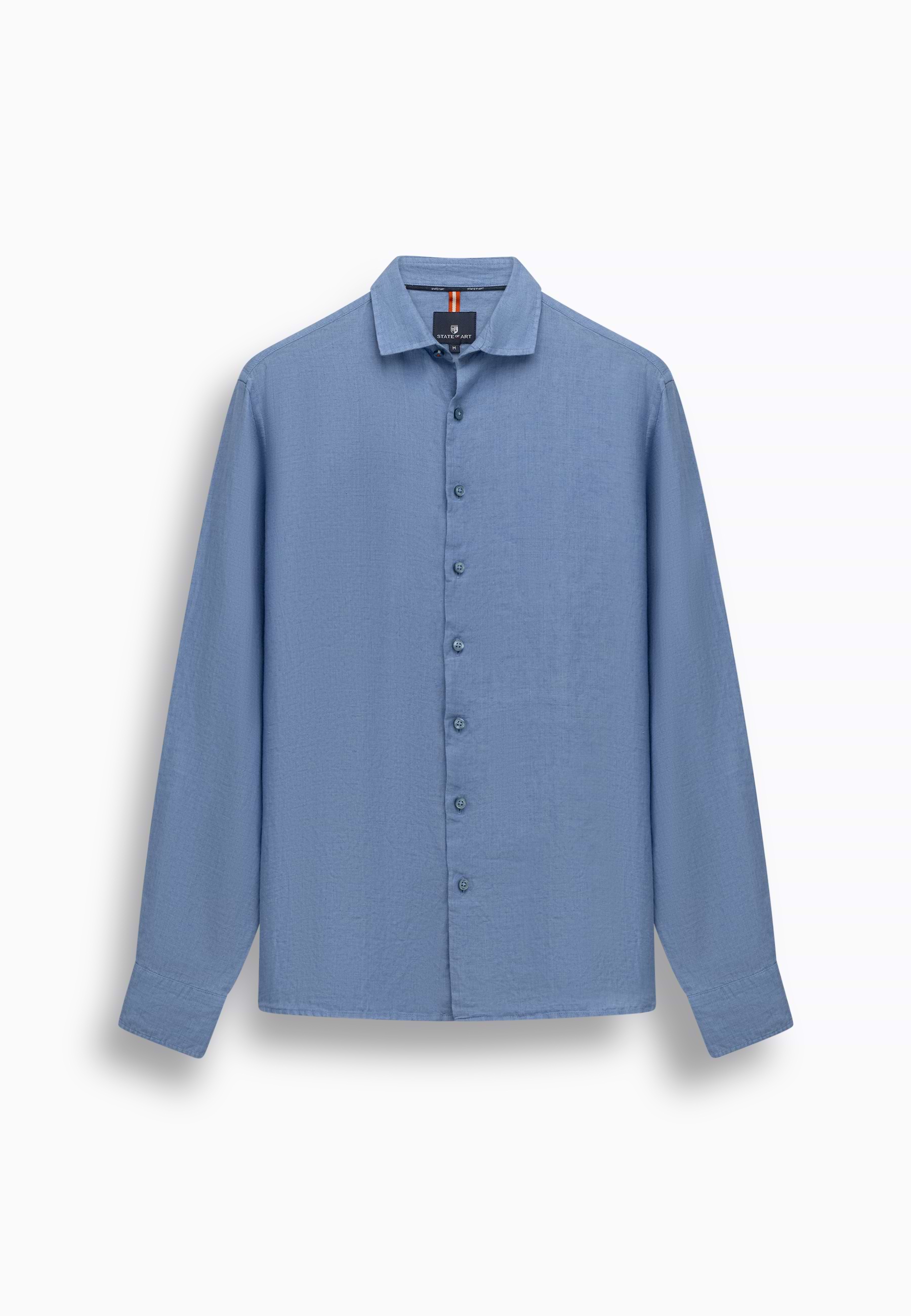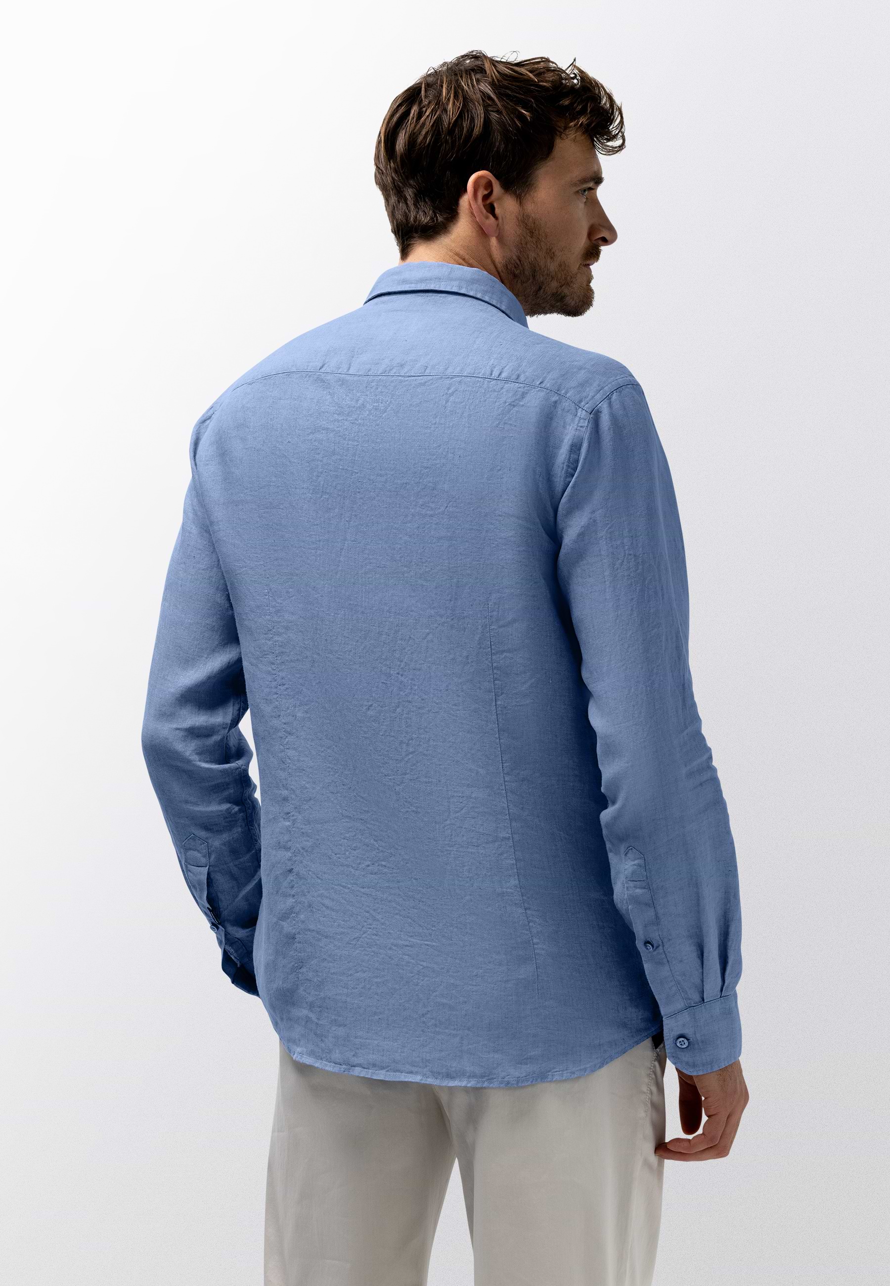 Dit overhemd in regular fit is uitgevoerd in een luchtige linnenkwaliteit met een subtiele gewassen look. De stof voelt licht en ademend aan en heeft een natuurlijke, licht nonchalante structuur die past bij een ontspannen maar verzorgde uitstraling. Dankzij de gewassen afwerking krijgt het overhemd een zacht draaggevoel en een subtiel levendig effect. De klassieke kraag zonder button-down en het ontbreken van een borstzak zorgen voor een strakke, minimalistische afwerking.