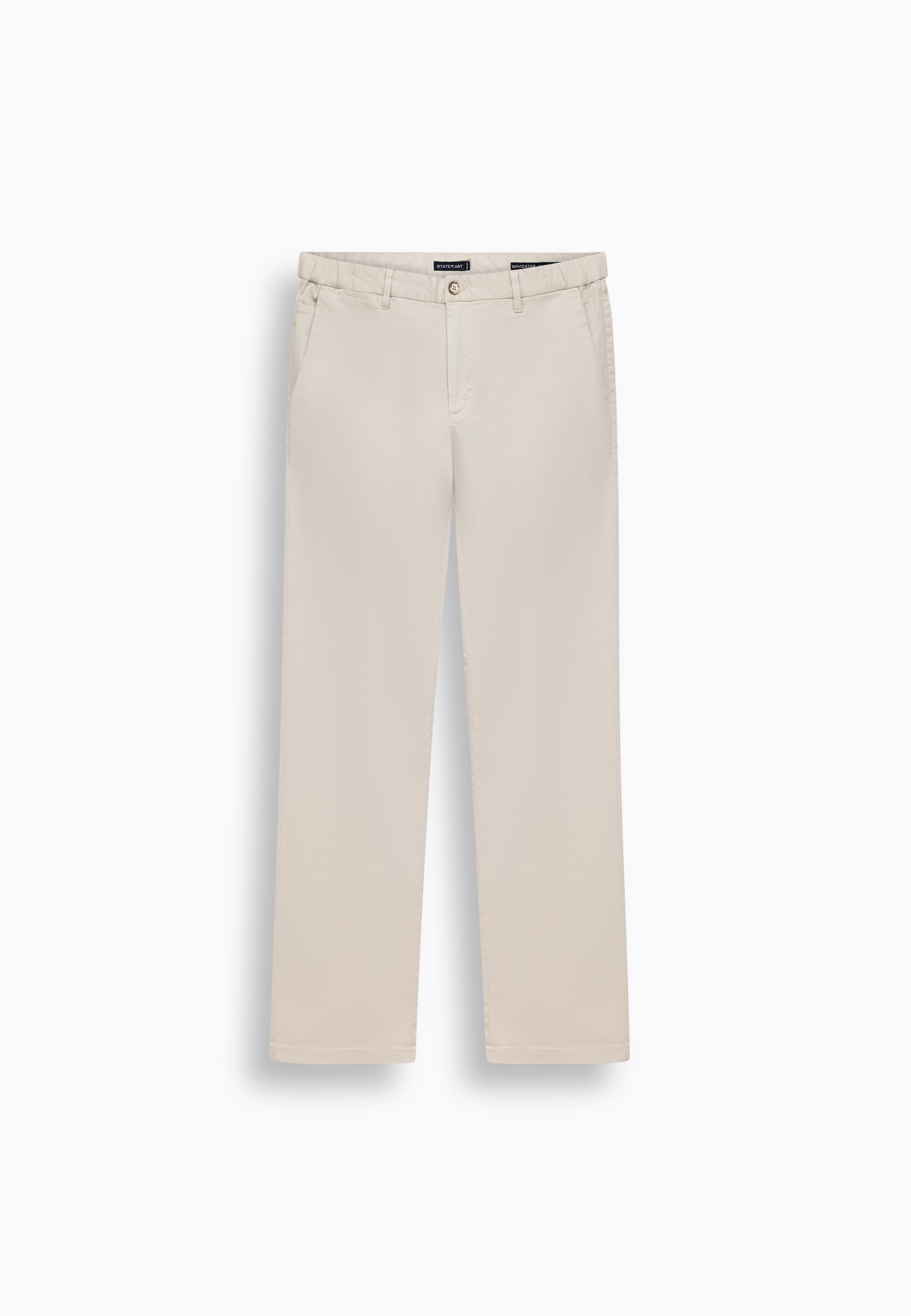 Deze chino is uitgevoerd in fijne katoenen twill met elastaan voor lichte stretch en prettige bewegingsvrijheid. De regular fit zorgt voor een comfortabele en verzorgde pasvorm. Afgewerkt met een tailleband met riemlussen, een knoop- en ritssluiting, steekzakken aan de voorzijde en paspelzakken aan de achterzijde. Elastische details aan de zijkanten verhogen het draagcomfort voor dagelijks gebruik.