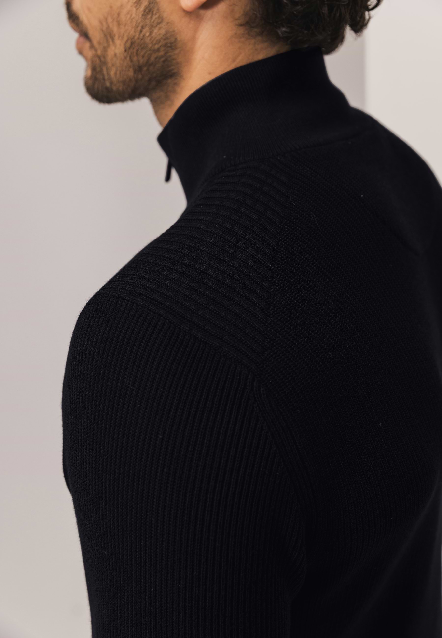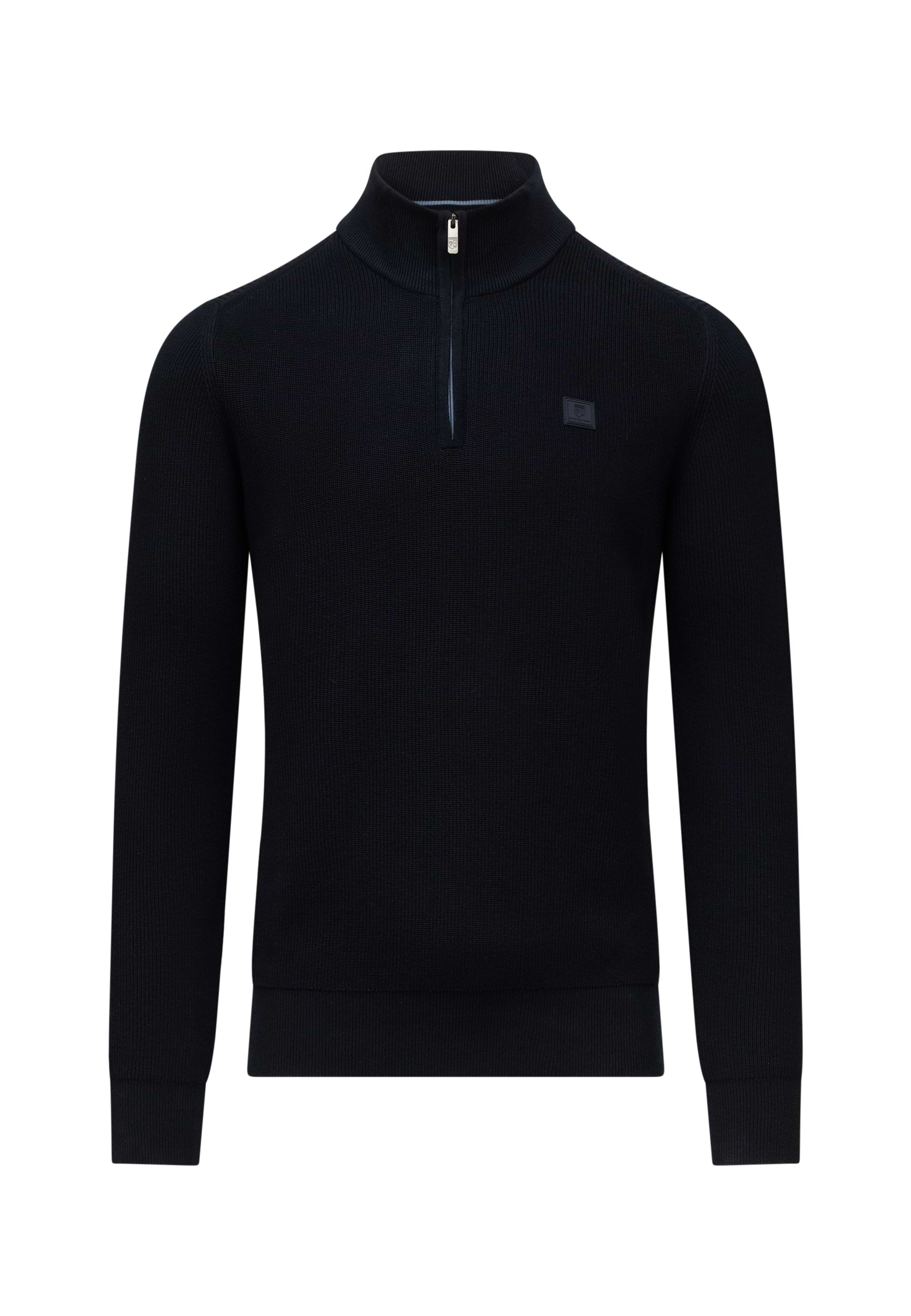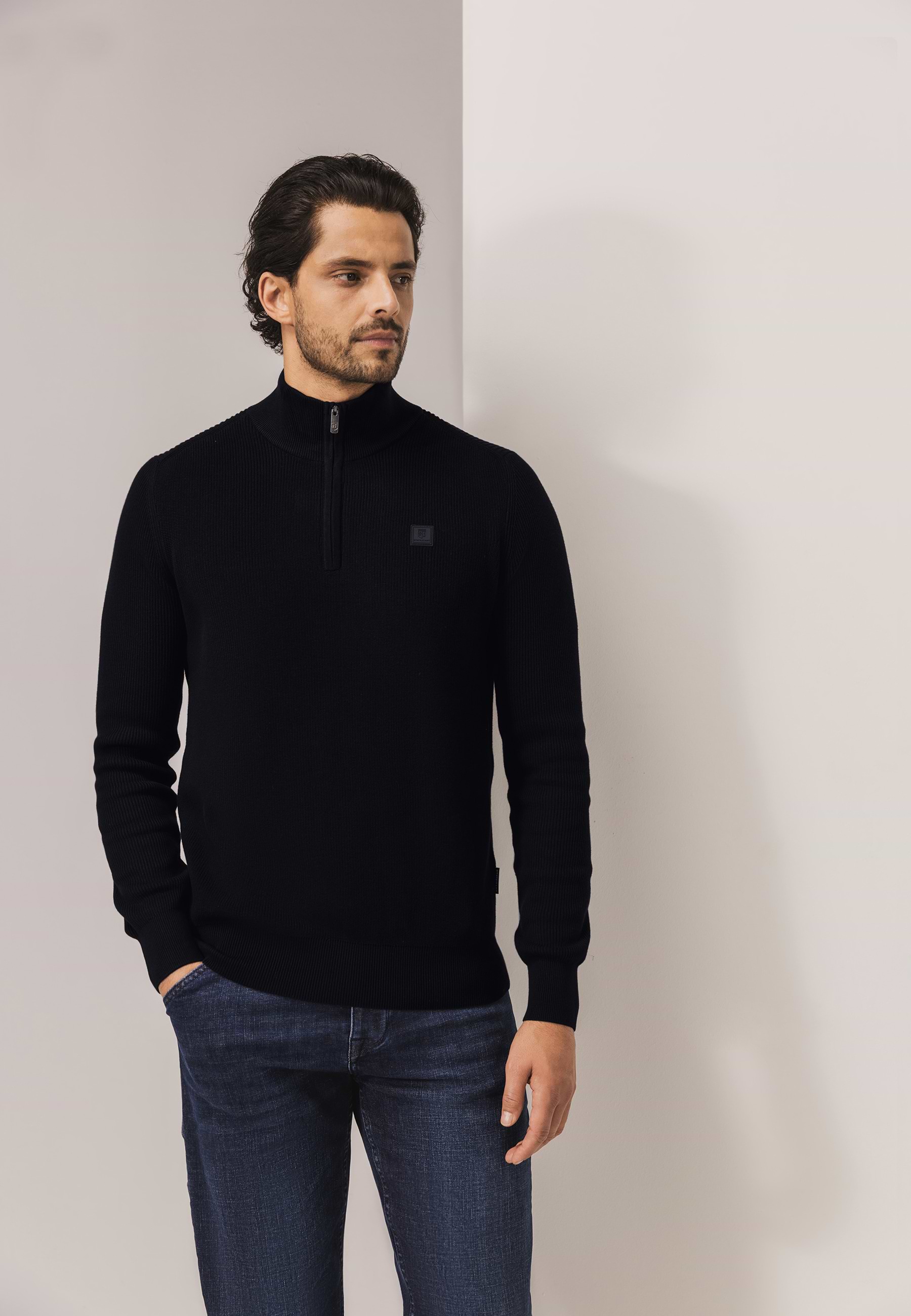 Deze trui is uitgevoerd in katoen van luxueuze kwaliteit en voorzien van een regular fit en een structuurpatroon dat zorgt voor subtiele diepte. De halve rits en opstaande kraag bieden praktische warmte, terwijl de schouderdetails en de rubberen badge op de borst een modern accent geven. De effen kleur maakt het een veelzijdig item binnen je garderobe.