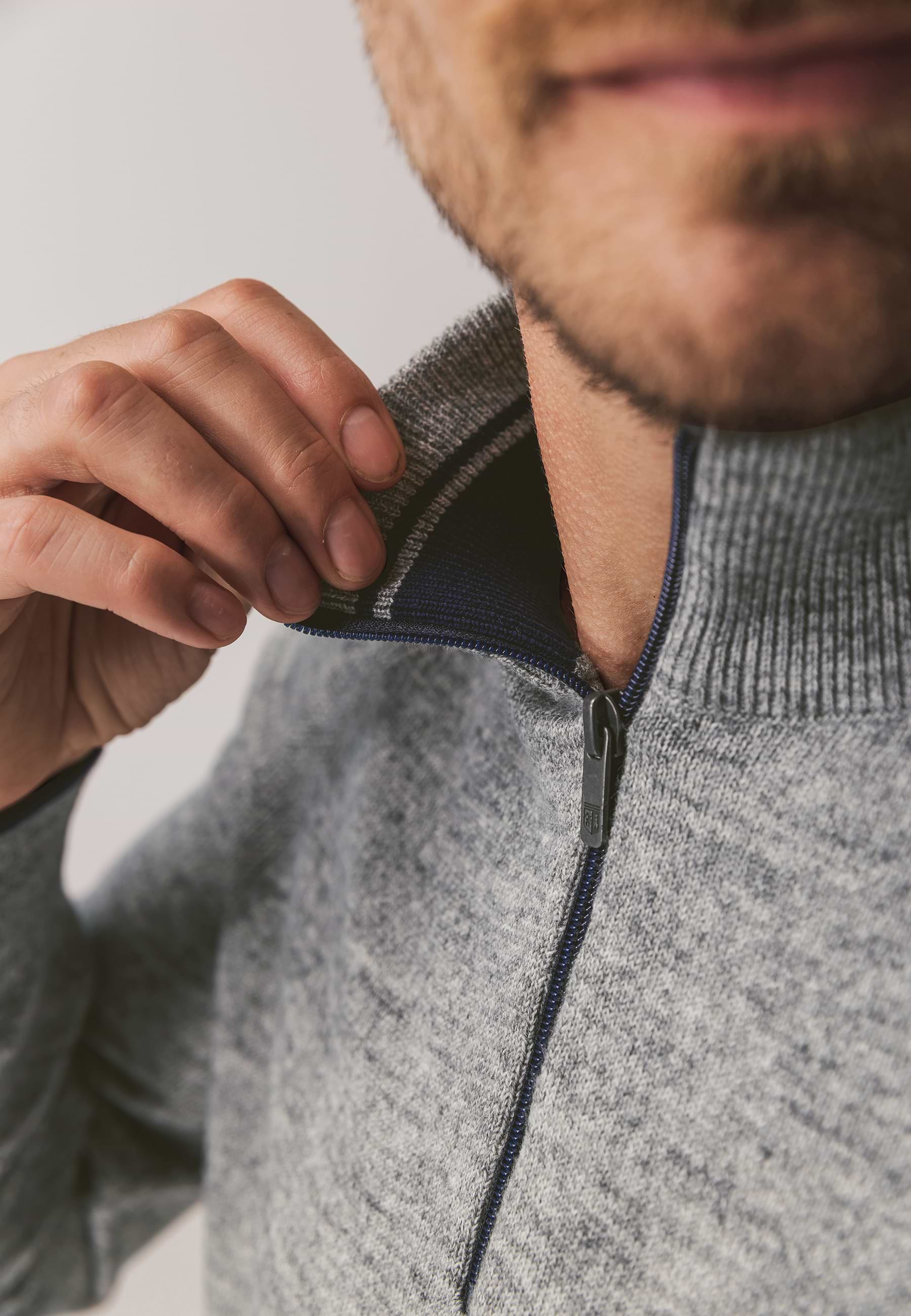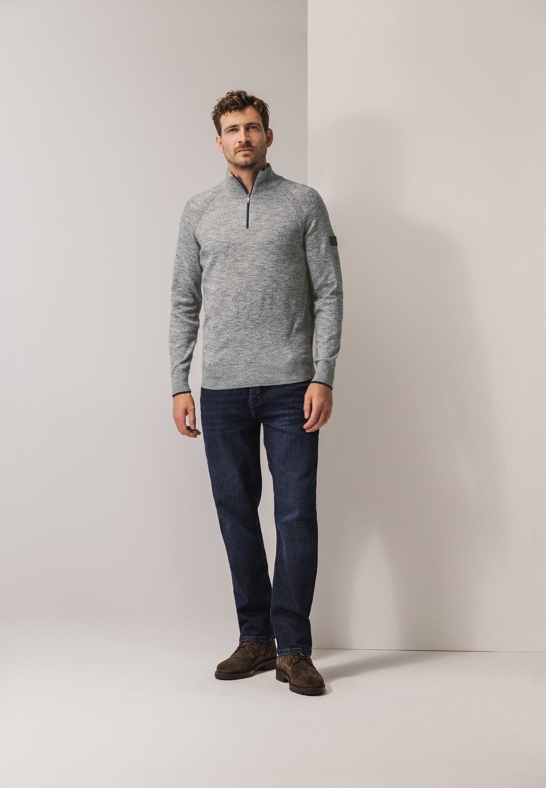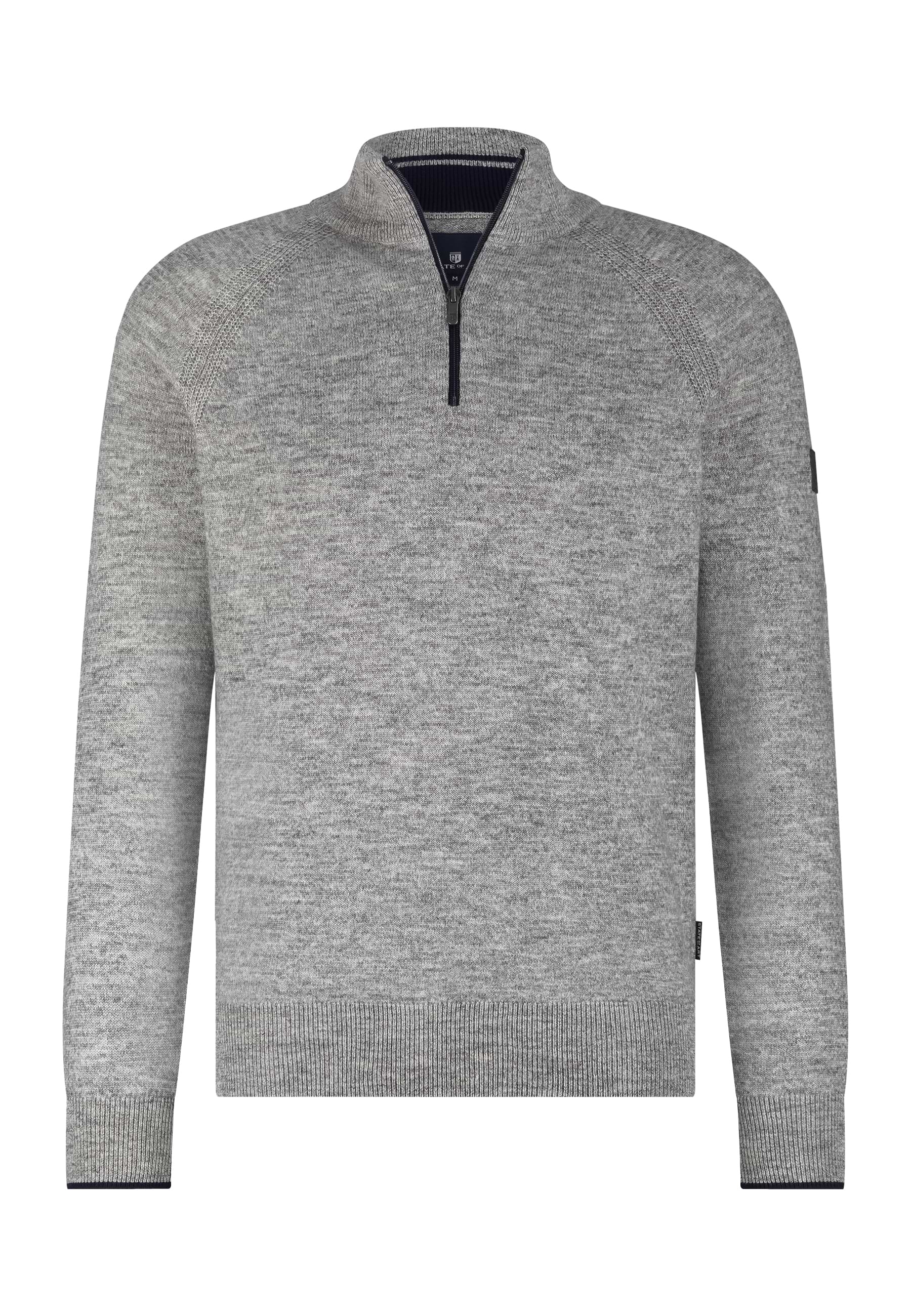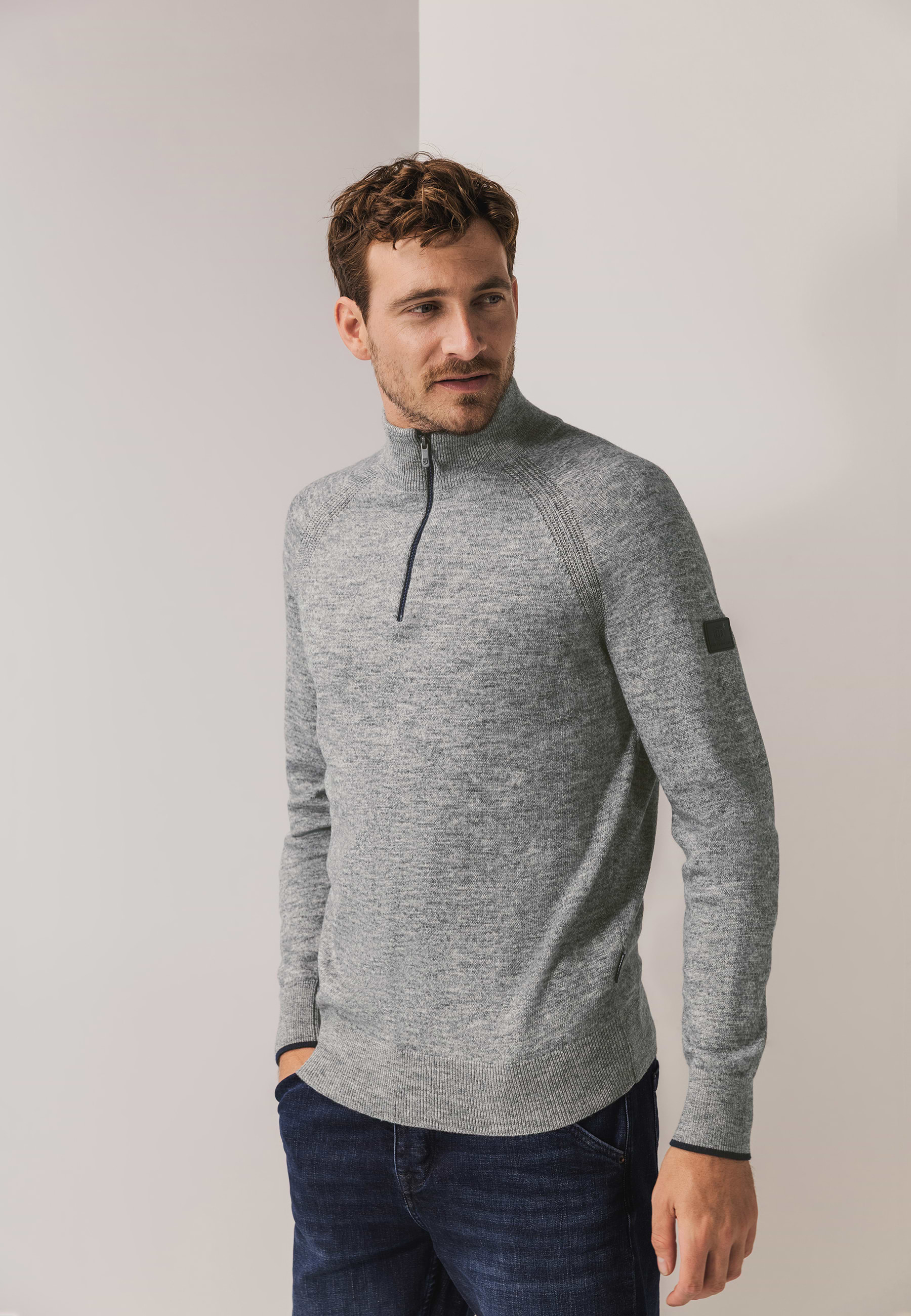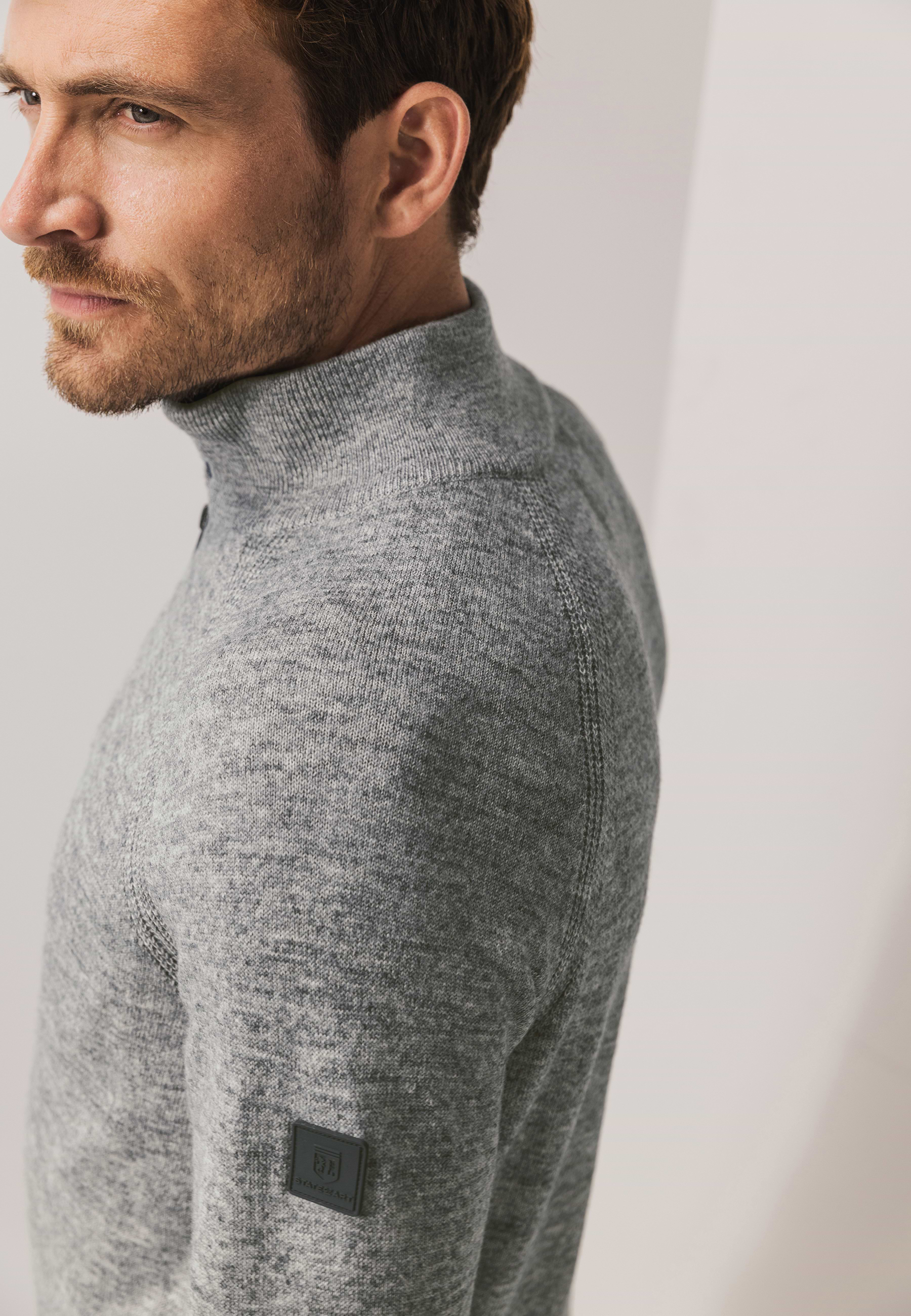 Deze gemêleerde trui met halve rits en raglanmouwen heeft een regular fit en is afgewerkt met een rubberen badge op de mouw en een subtiele streep in de mouwboord. Het gebruik van CIPRO-garen, een gladde mix van acryl, katoen en polyester, zorgt voor een zachte feel, blijvende pasvorm en subtiele glans, terwijl de ribstructuur bij boord en mouwen het geheel netjes afsluit.
