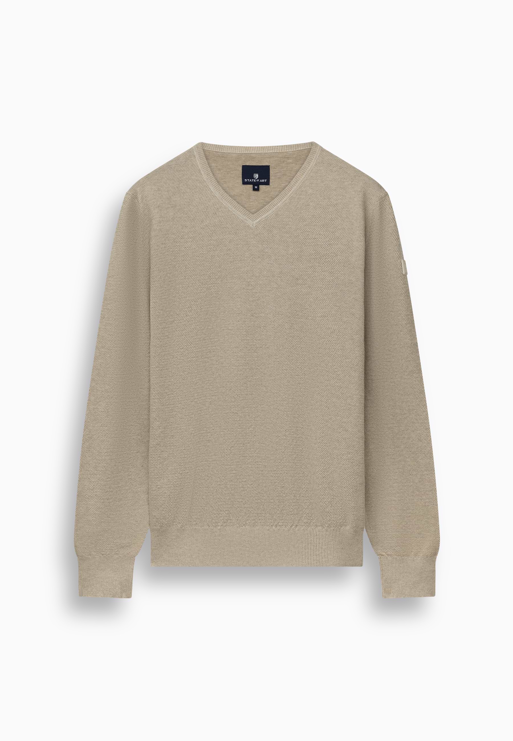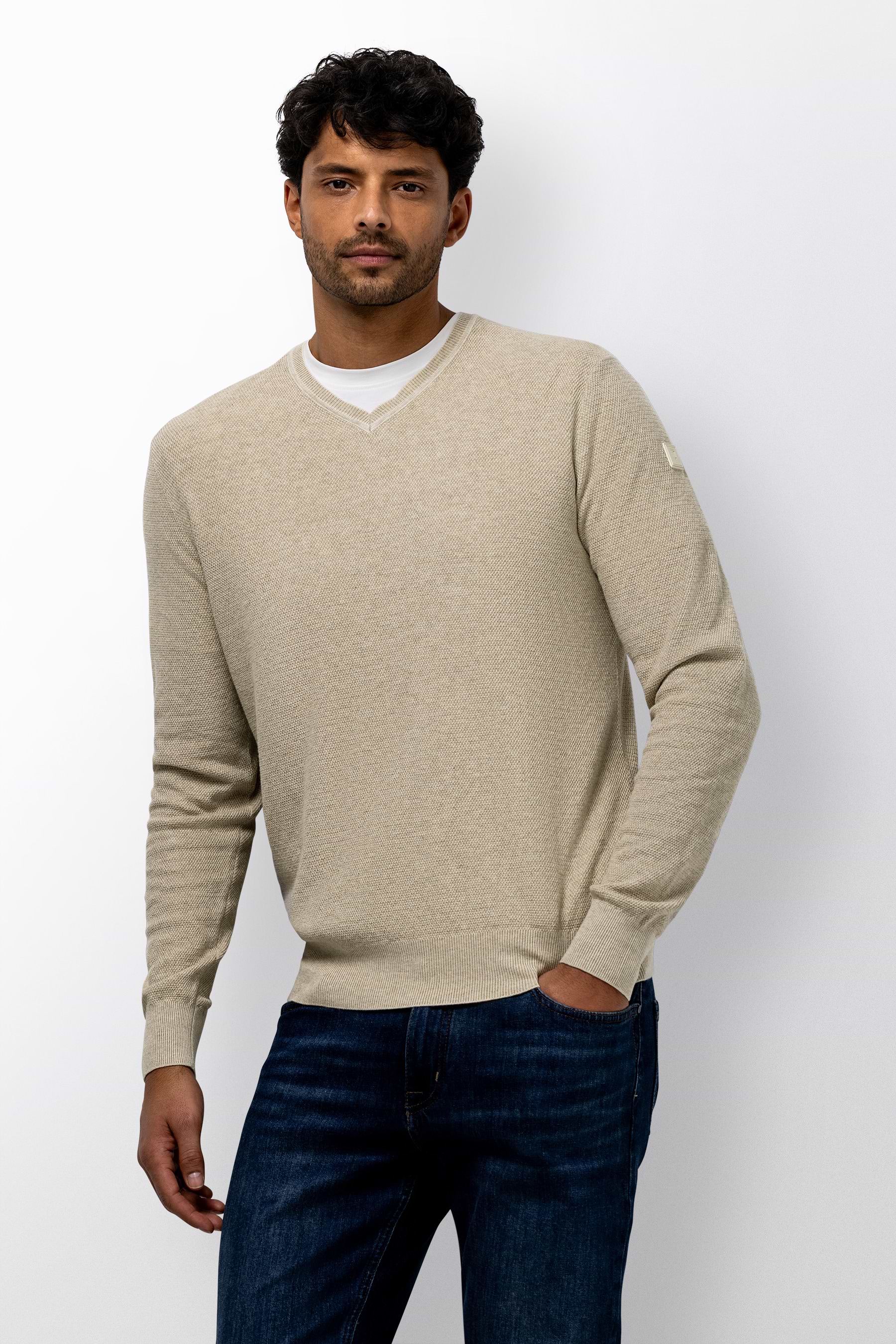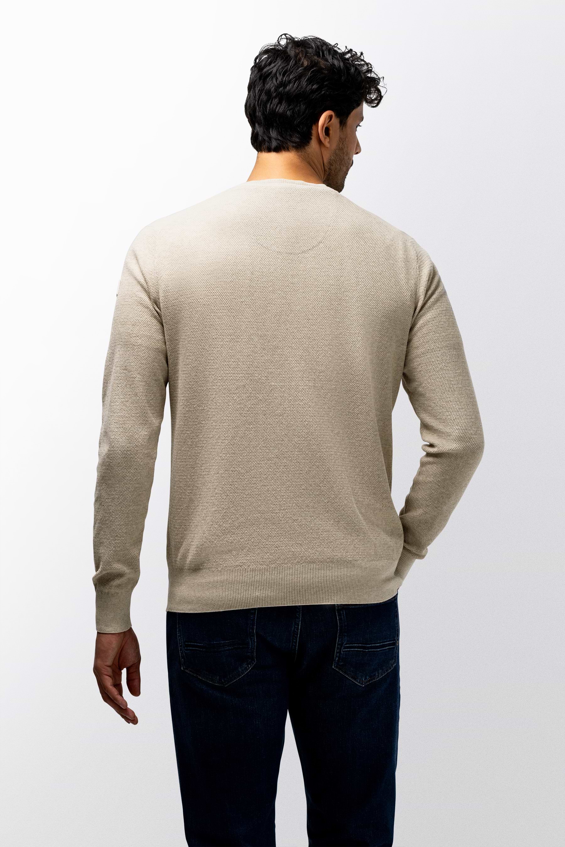 Deze gemêleerde trui met V-hals heeft een tijdloze uitstraling en een comfortabele regular fit, terwijl het fijne rijstkorrelpatroon zorgt voor een subtiele structuur en de zachte katoenen kwaliteit prettig draagt. De rubberen badge op de mouw voegt een modern detail toe en maakt de trui geschikt voor zowel casual als verzorgde outfits.
