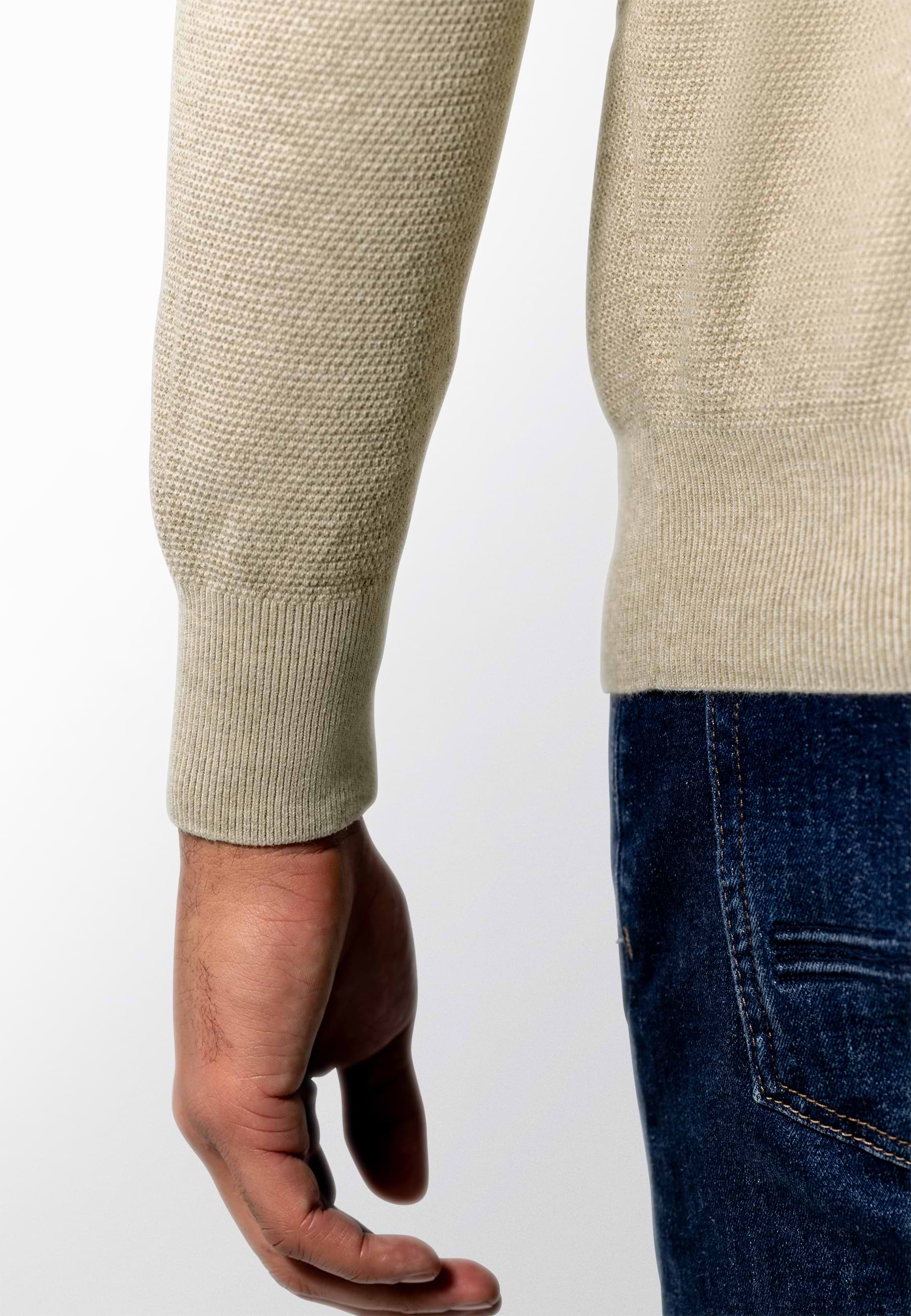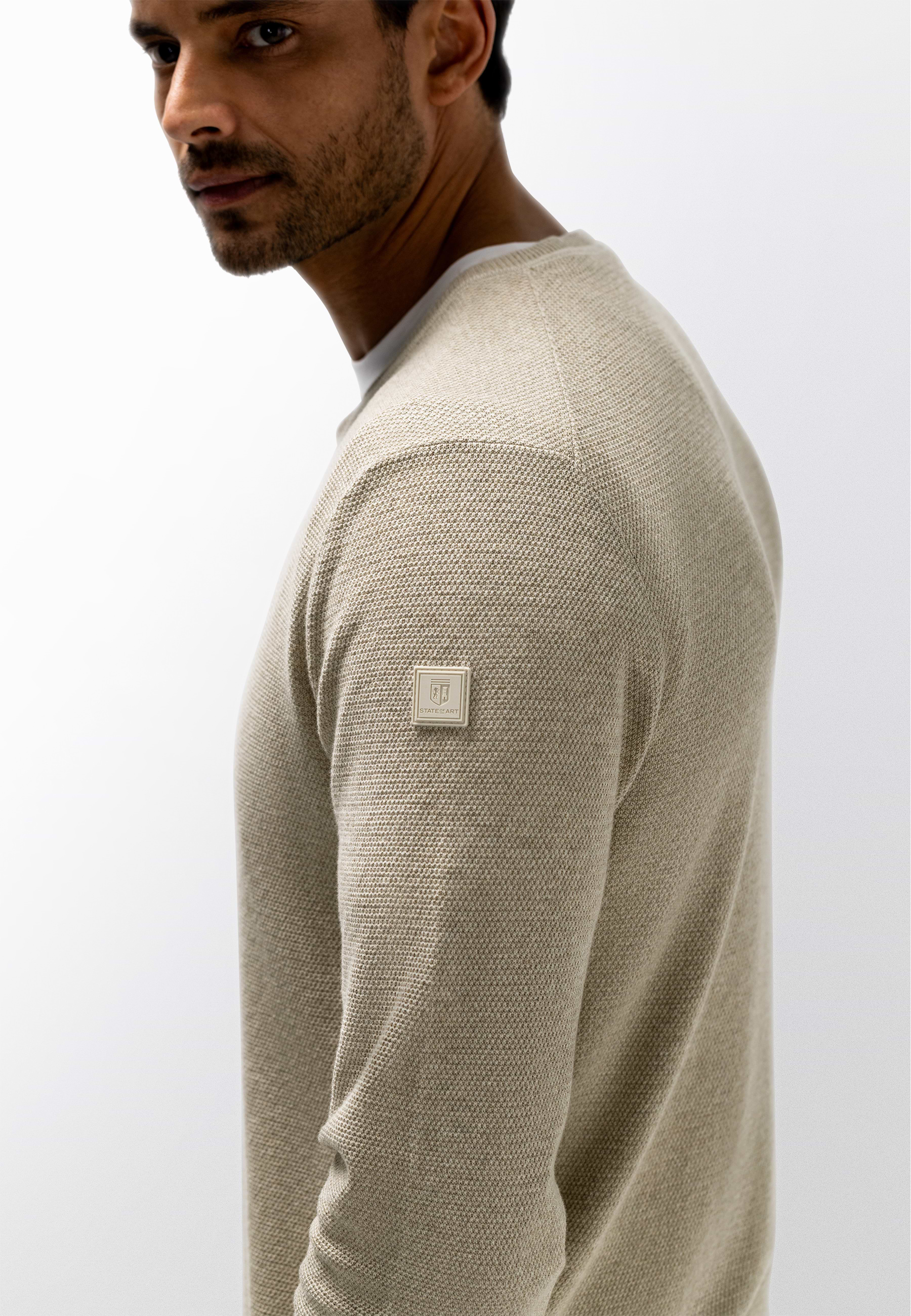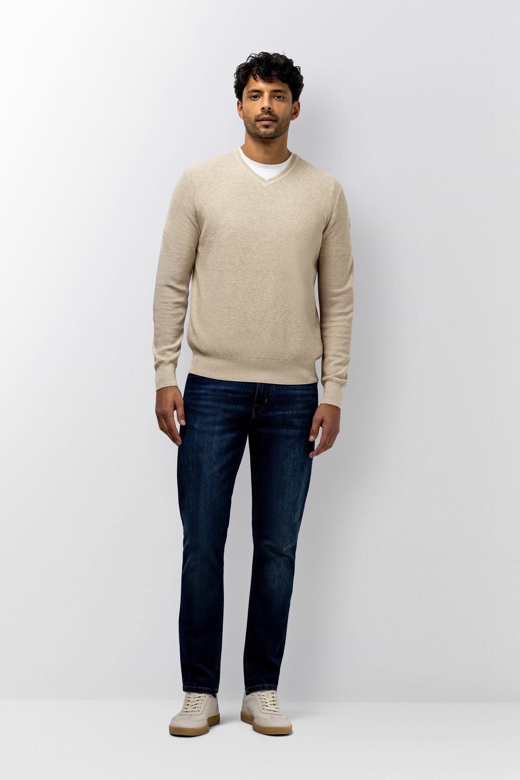 Deze gemêleerde trui met V-hals heeft een tijdloze uitstraling en een comfortabele regular fit, terwijl het fijne rijstkorrelpatroon zorgt voor een subtiele structuur en de zachte katoenen kwaliteit prettig draagt. De rubberen badge op de mouw voegt een modern detail toe en maakt de trui geschikt voor zowel casual als verzorgde outfits.